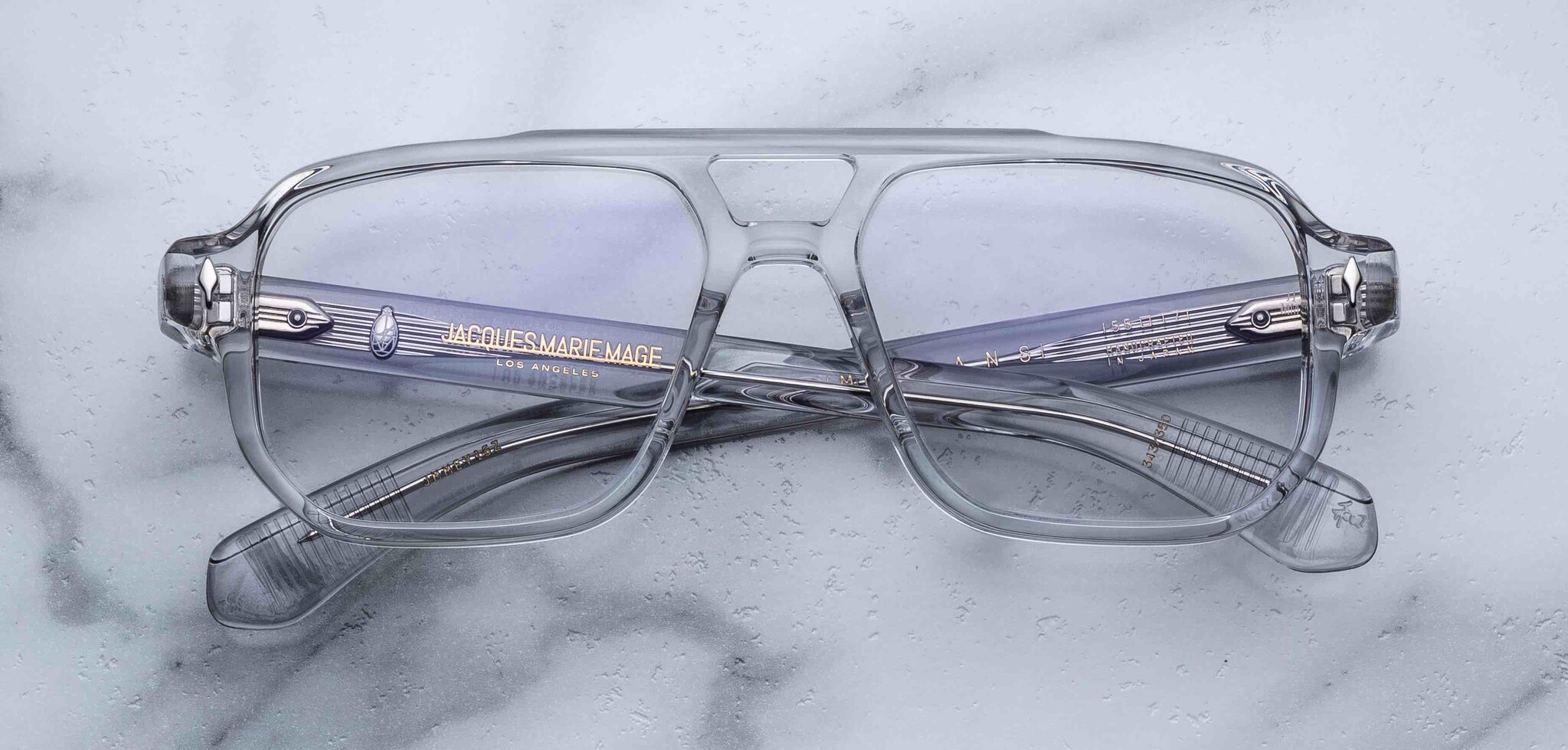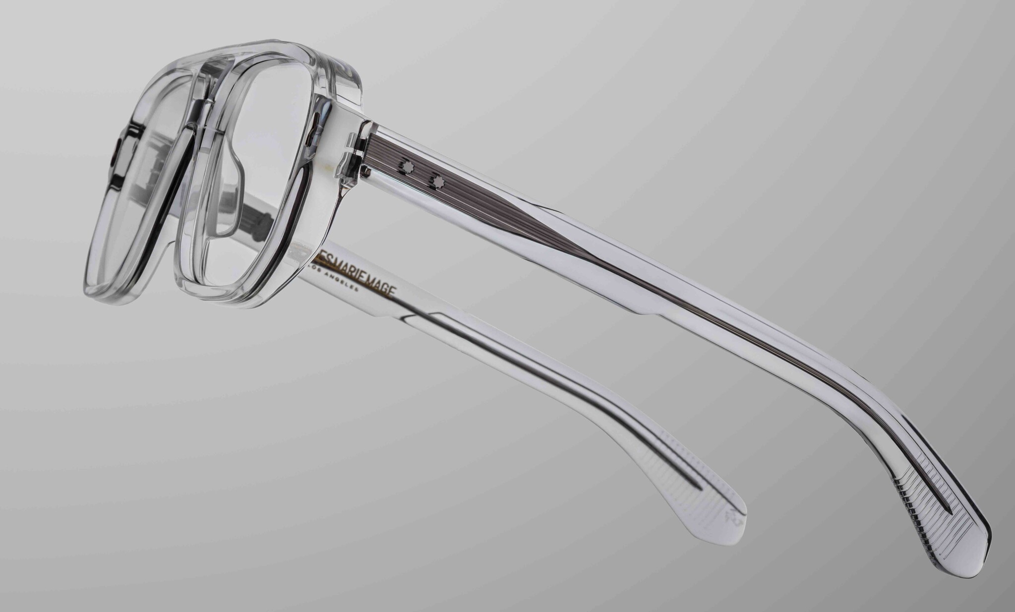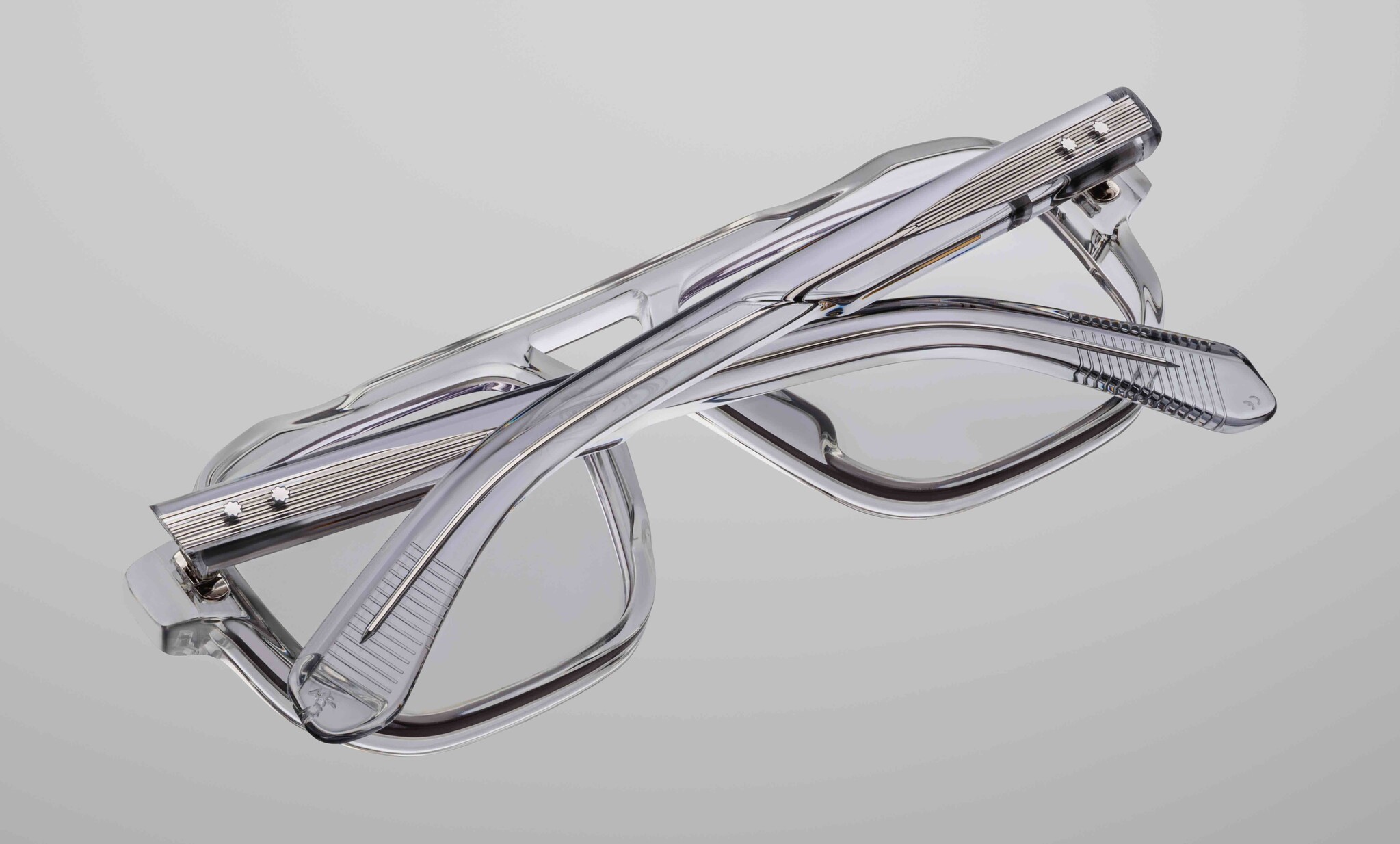 grey 8mm cured cellulose acetate frame custom double laminated acetate temples featuring precious metal hardware and grey lenses