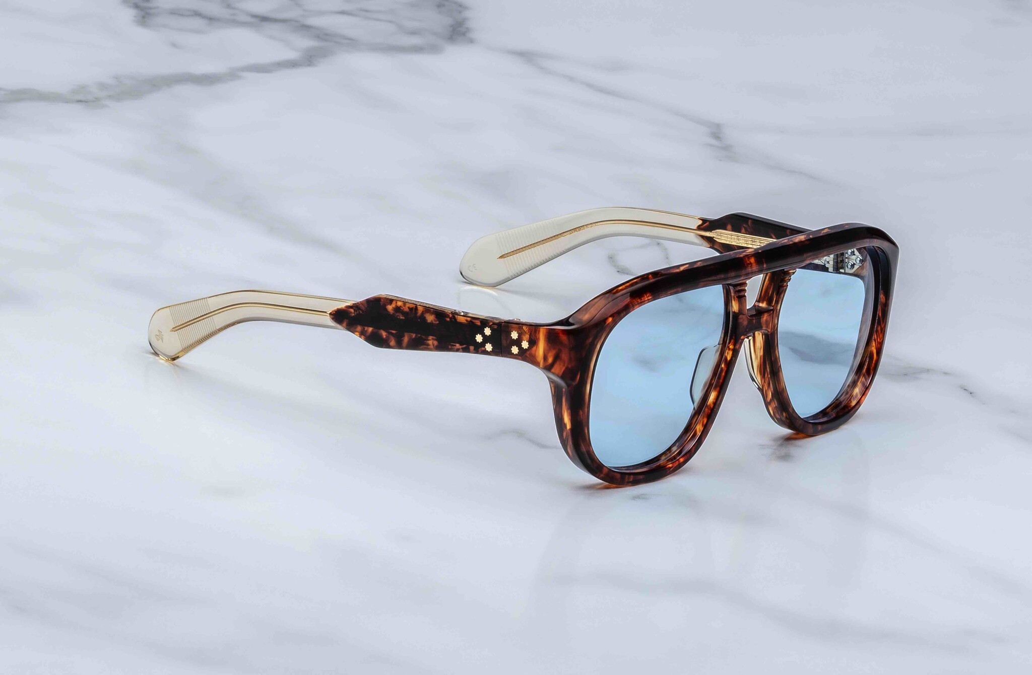 havana 8mm cured cellulose acetate frame with custom double-laminated acetate temples featuring precious metal hardware and blue lenses