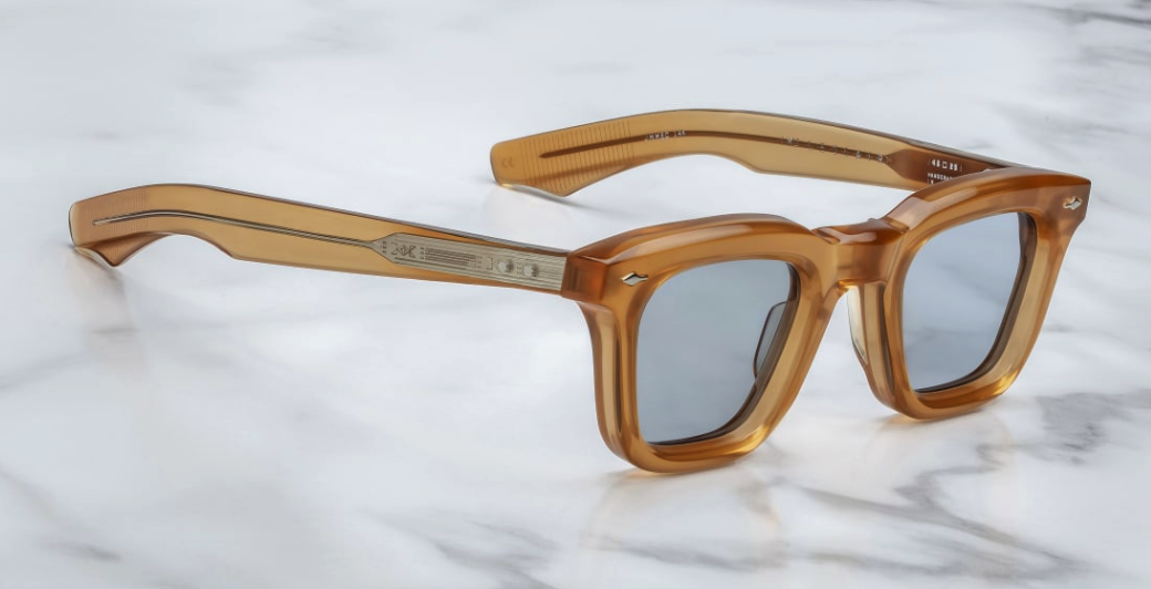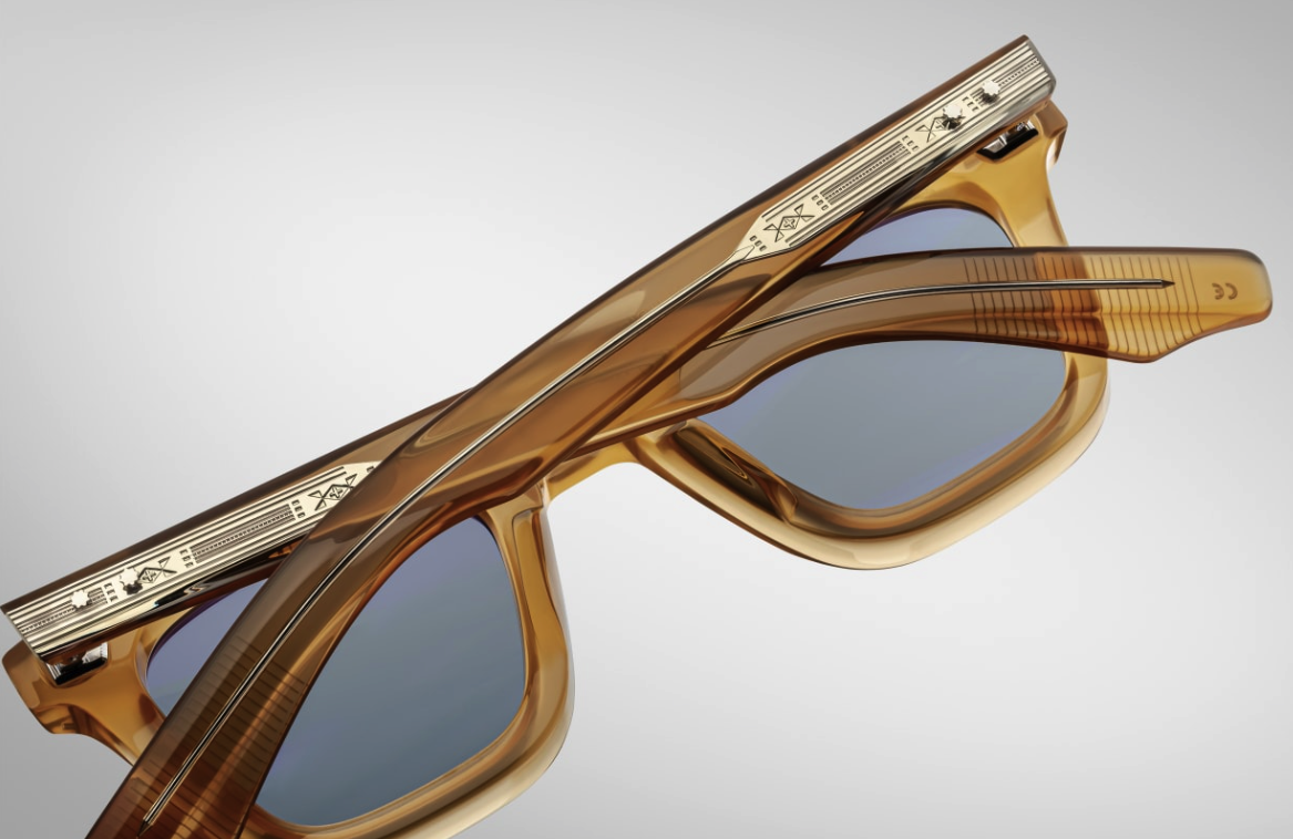 - BROWN 10MM CURED CELLULOSE ACETATE FRAME WITH CUSTOM DOUBLE LAMINATED ACETATE TEMPLES FEATURING PRECIOUS METAL HARDWARE AND PRIMARY GREY LENSES