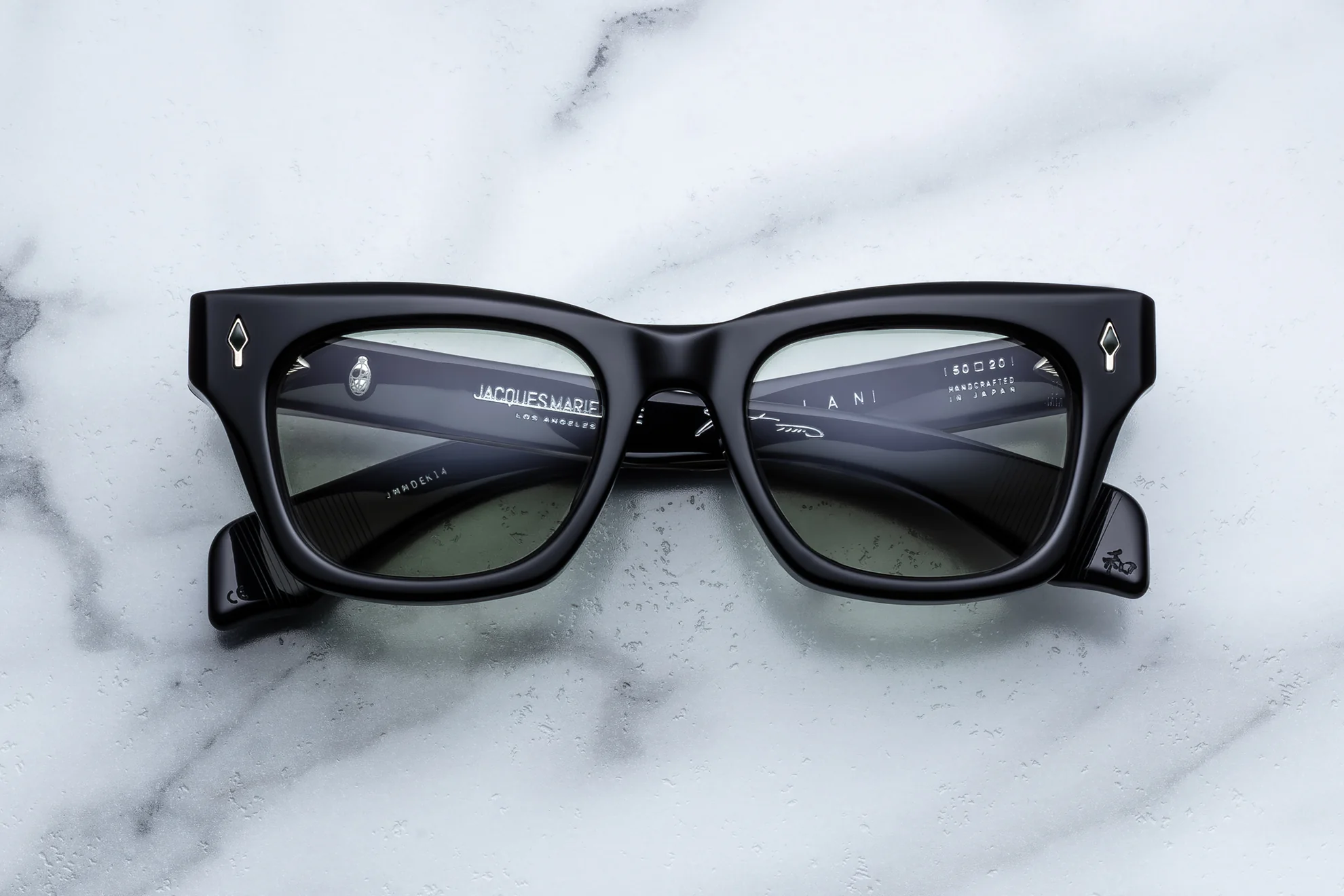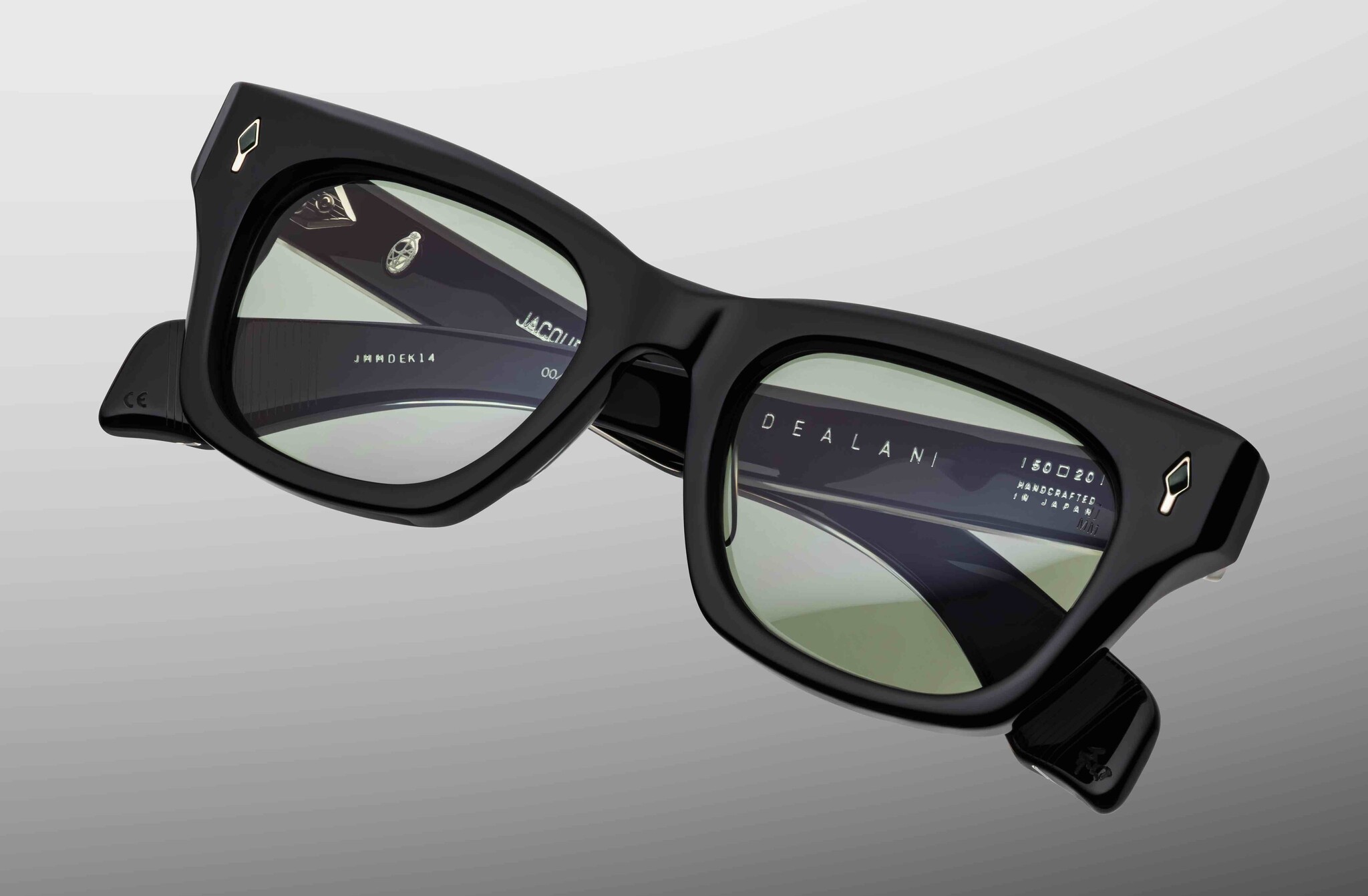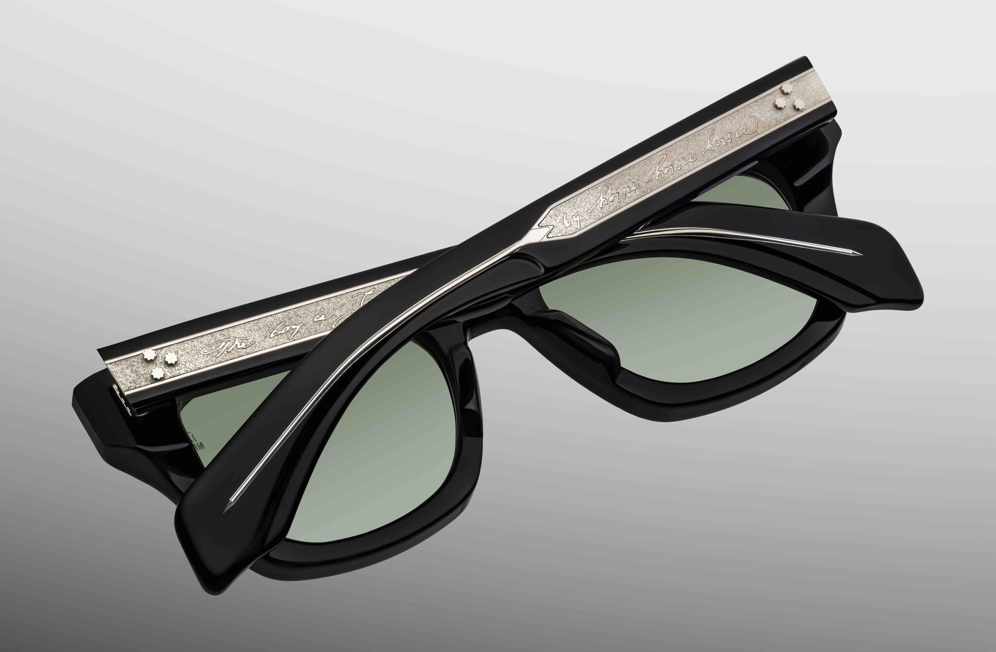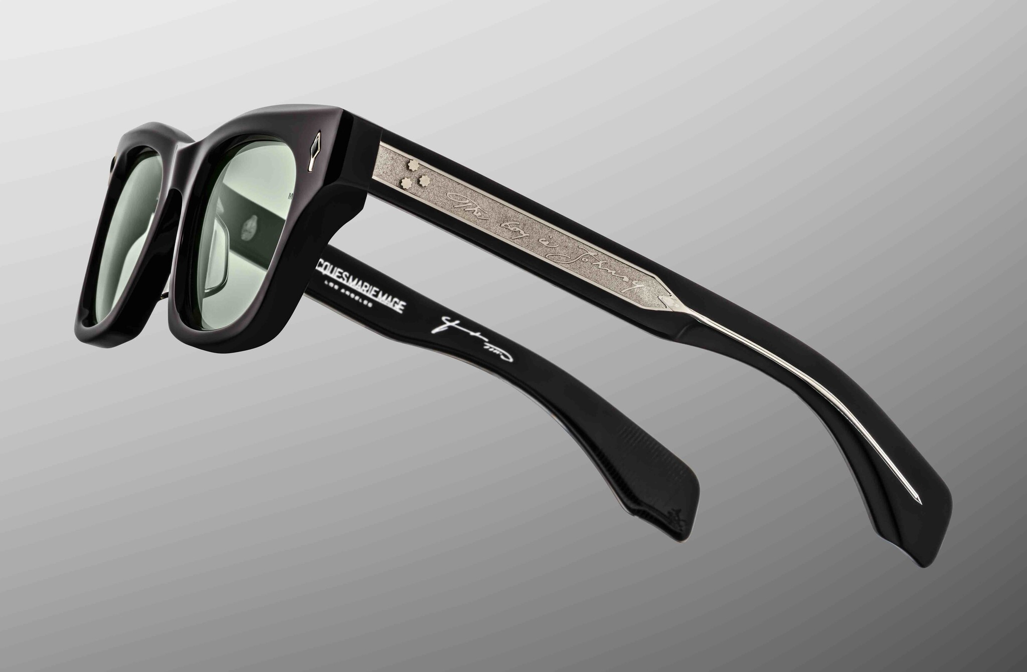 10mm cured cellulose acetate frame in polished black, with custom double-laminated temples composed of clear exteriors and polished black interiors, complemented by armorlite 6-base lenses in light bottle green with backside anti-reflective treatment