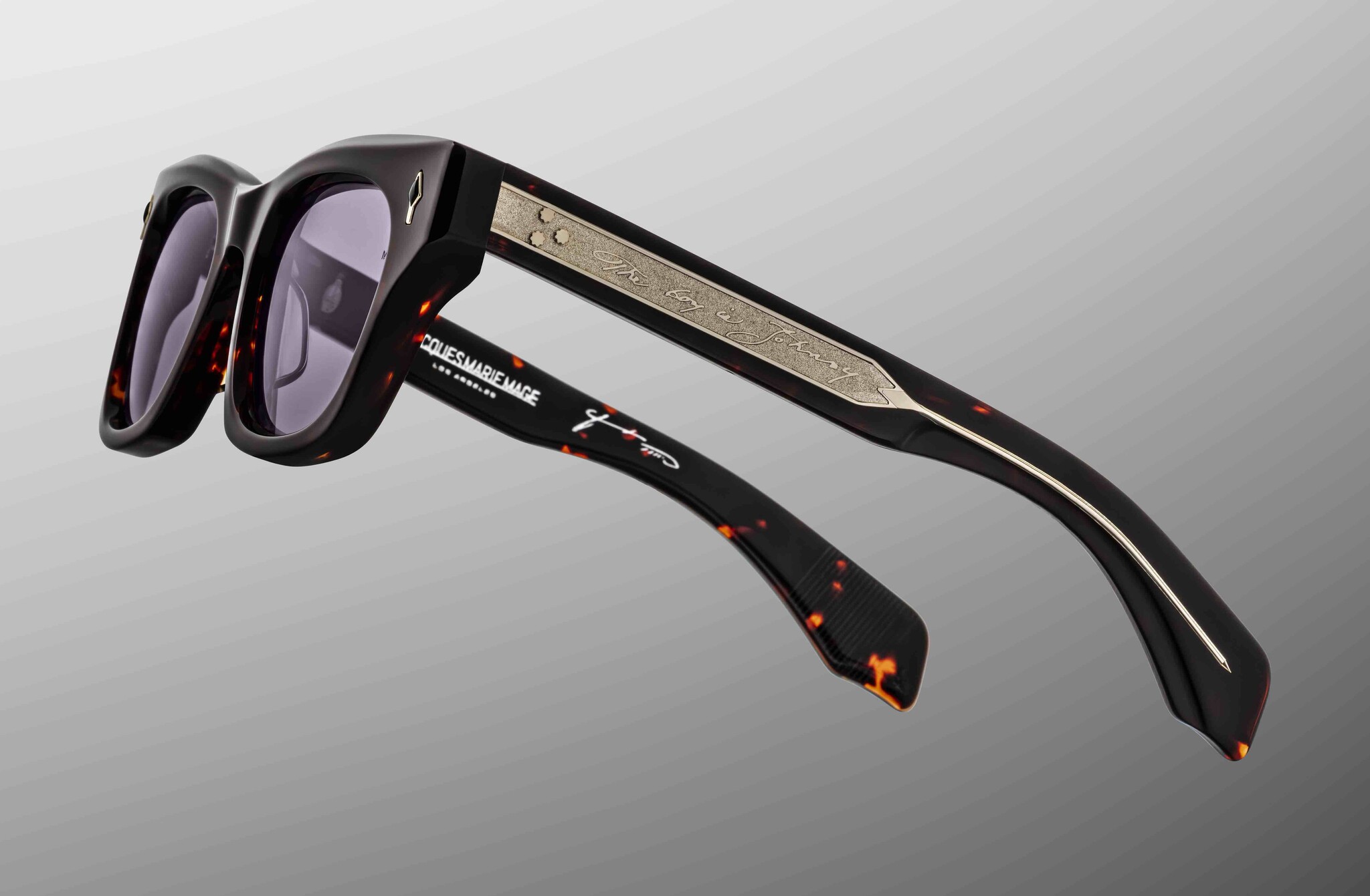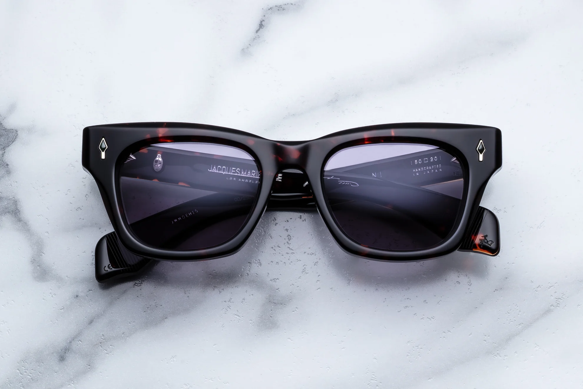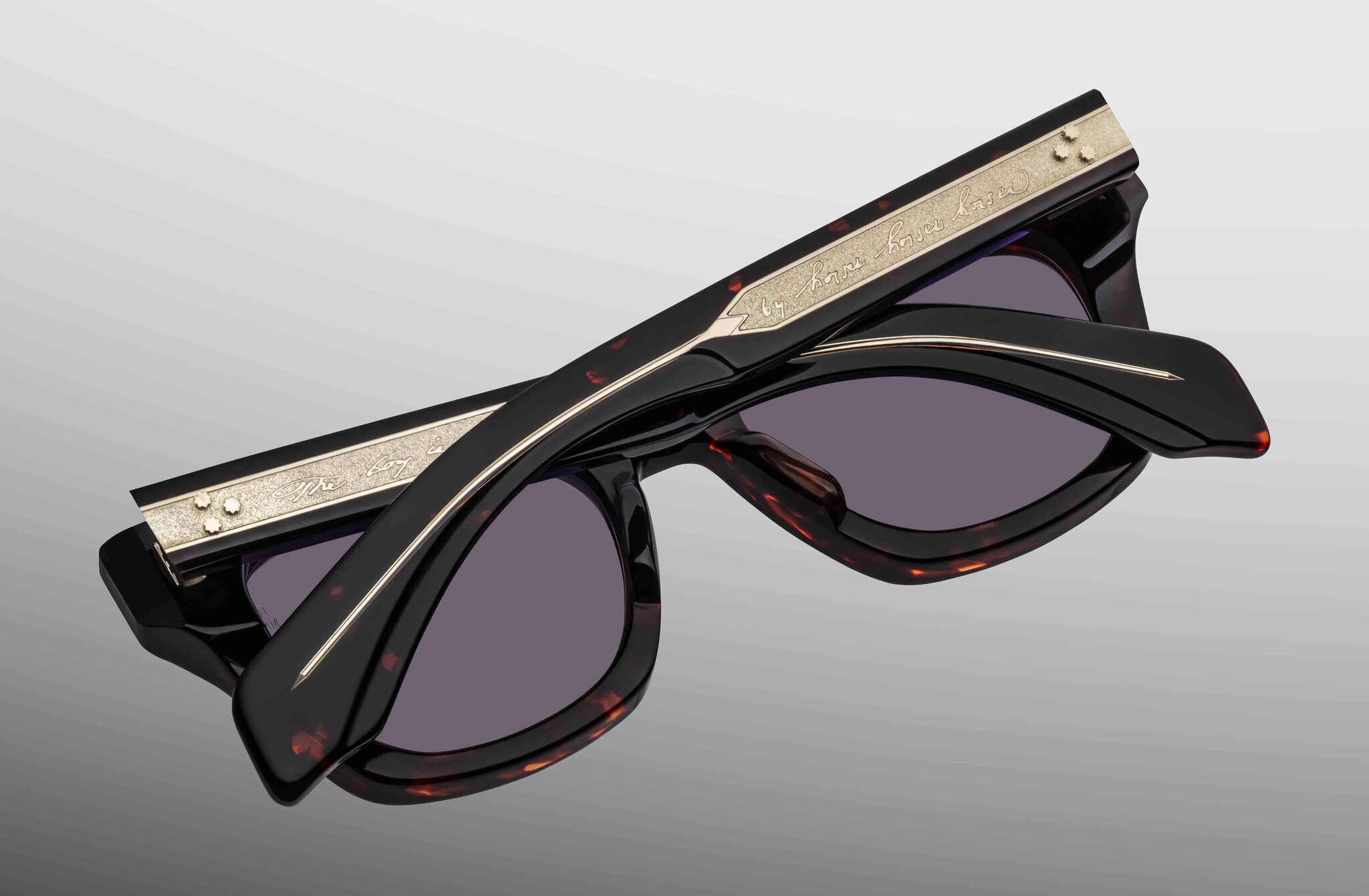 10mm cured cellulose acetate frame in polished havana, with custom double-laminated temples composed of clear beige exteriors and polished havana interiors, complemented by armorlite 6-base lenses in nimbus with backside anti-reflective treatment