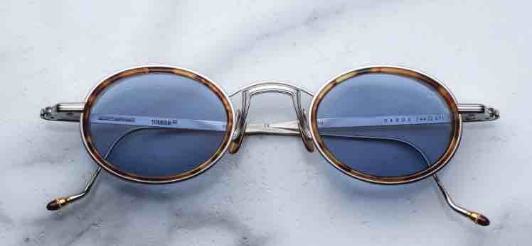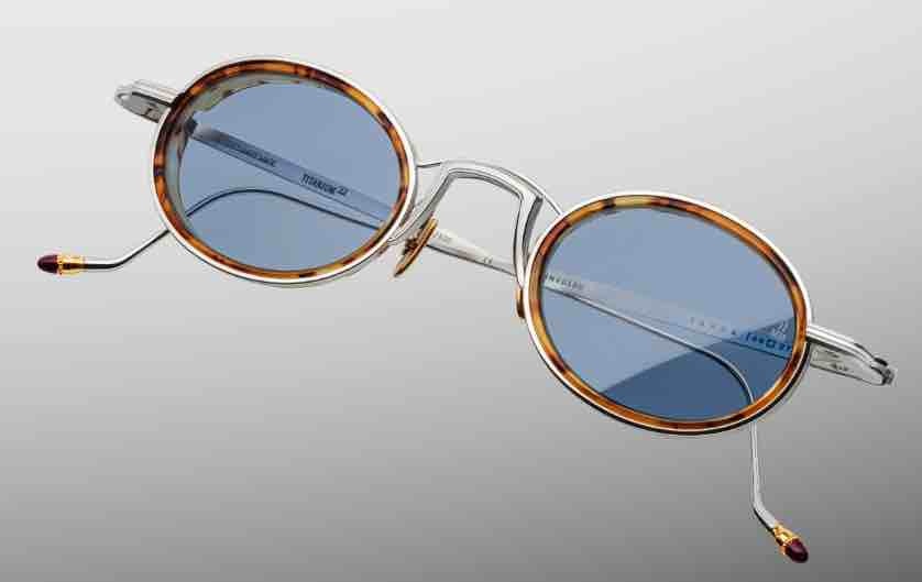 silver-finished 100% beta titanium frame with light havana cured cellulose acetate eye-rim inserts and blue lenses
