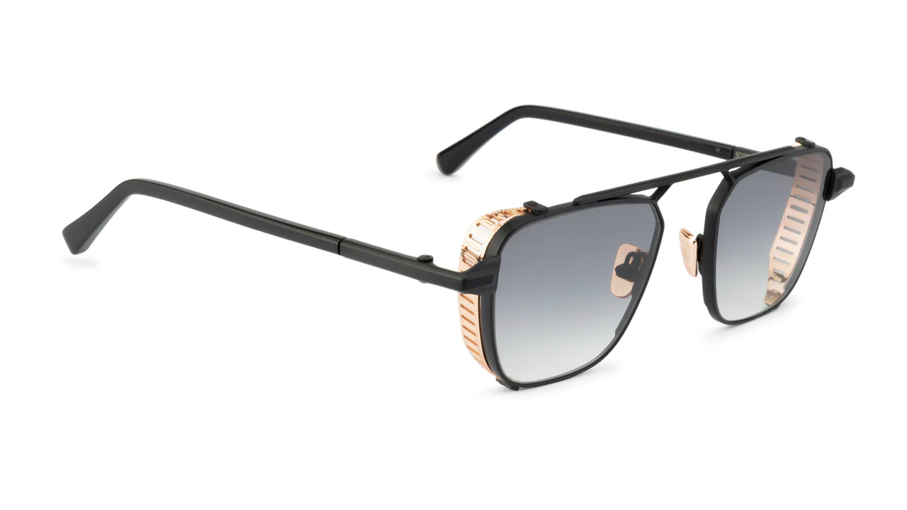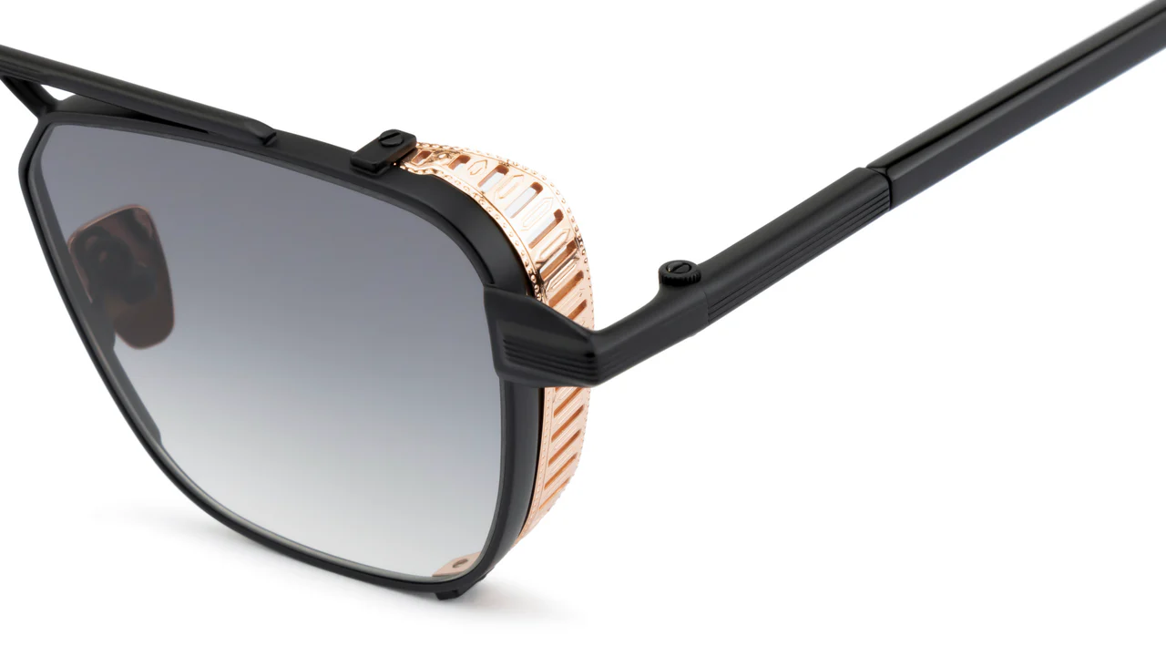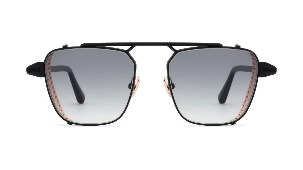 The metal corewire is made of stainless steel frame with a carbon black finish. Side shields and nose pads in rose gold color. Temple tips in black acetate.