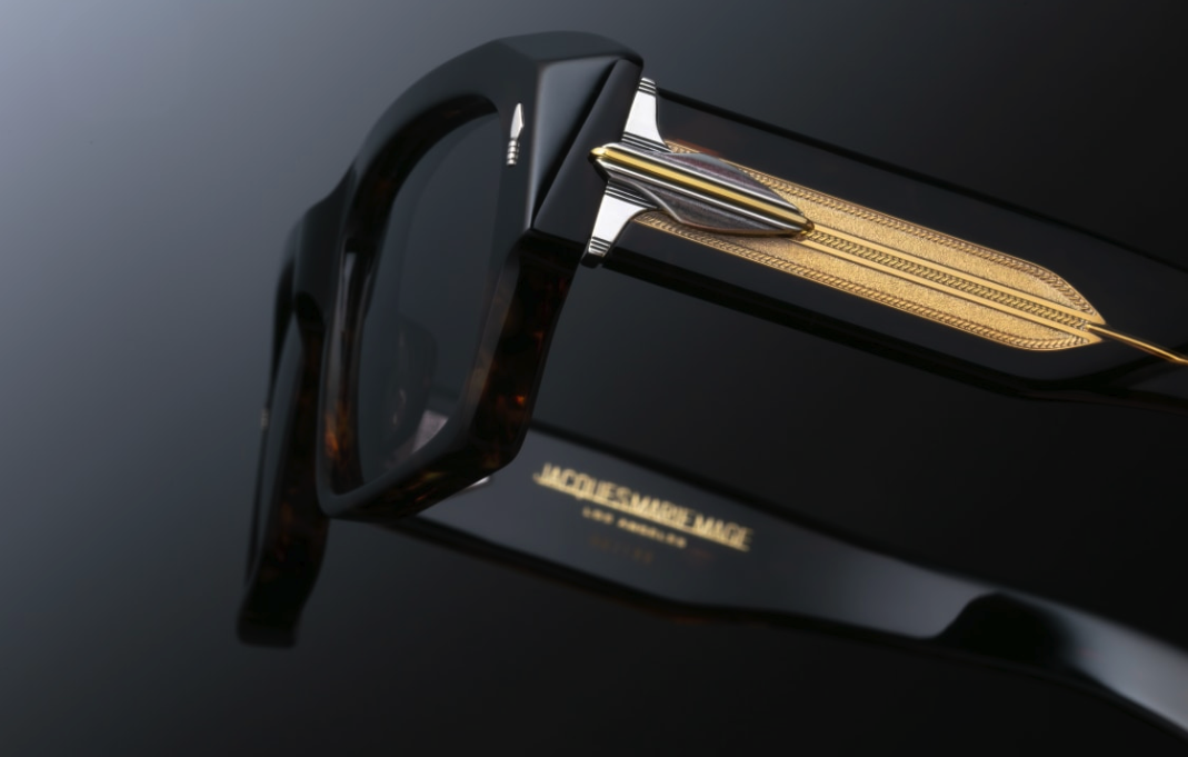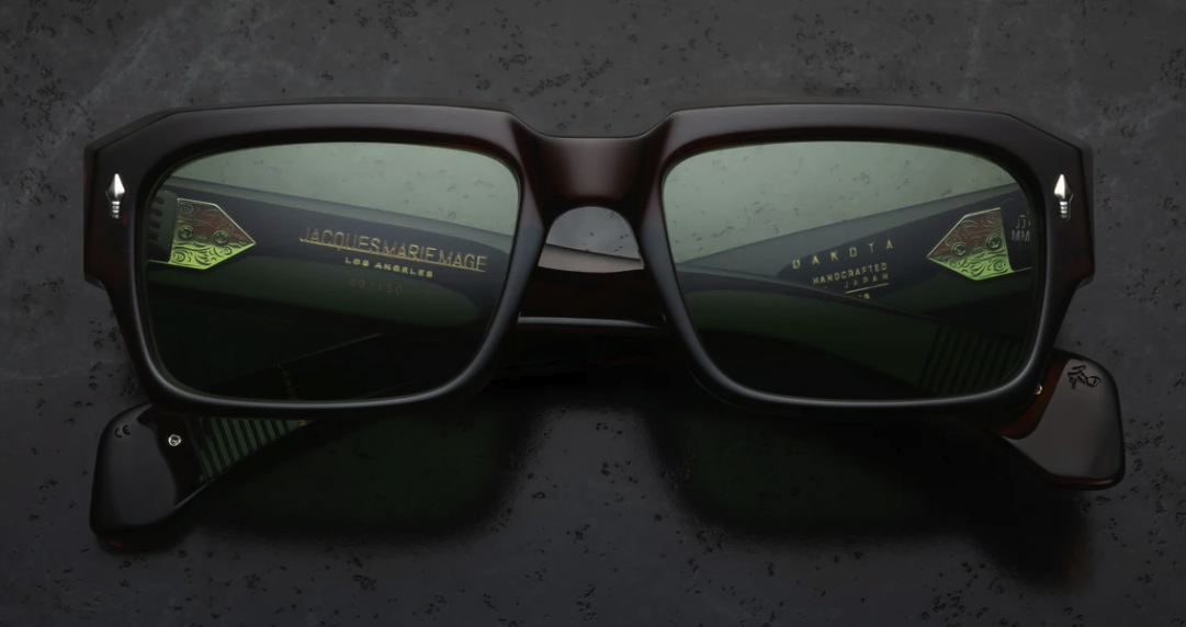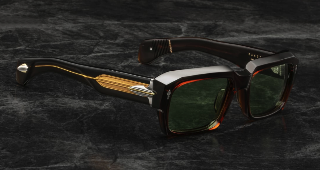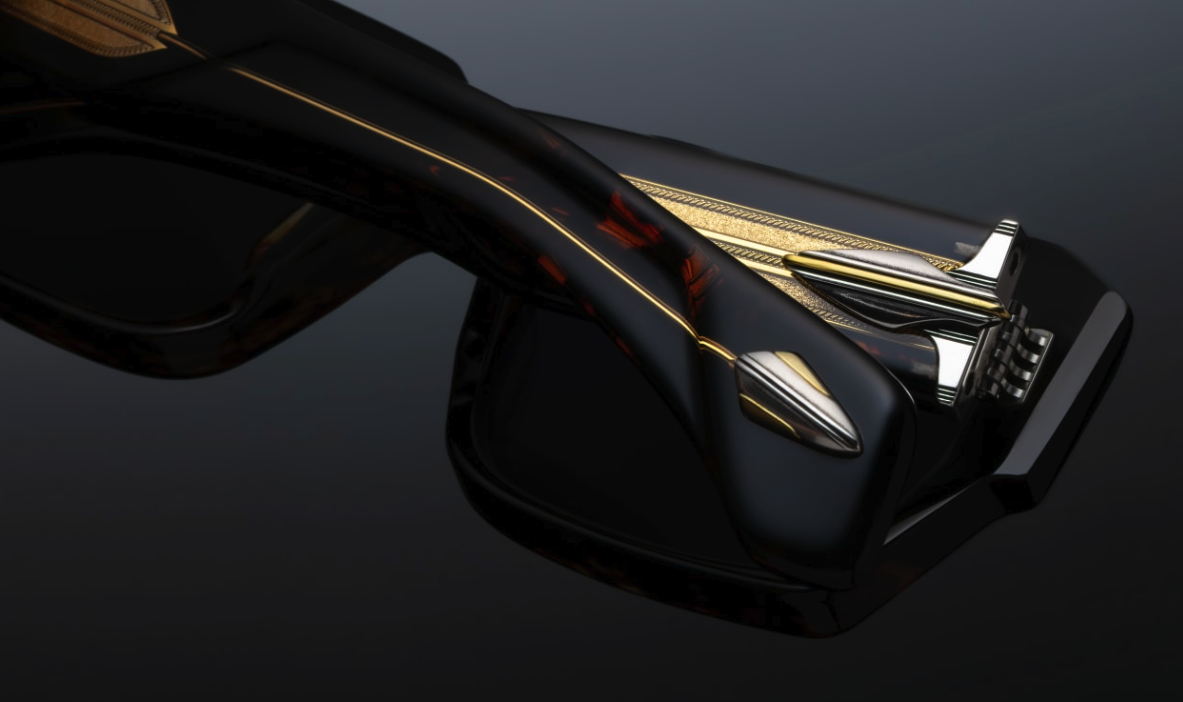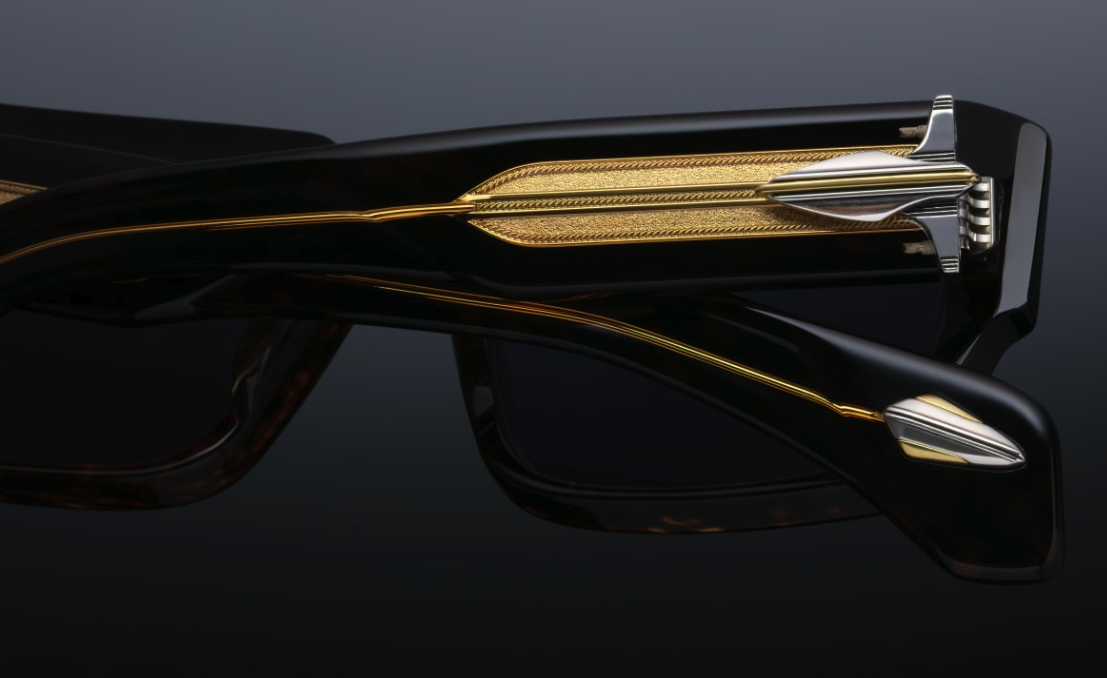 - BROWN 10MM CURED CELLULOSE ACETATE FRAME WITH CUSTOM DOUBLE LAMINATED ACETATE TEMPLES FEATURING PRECIOUS METAL HARDWARE AND GREEN LENSES