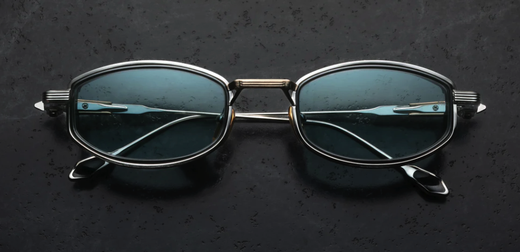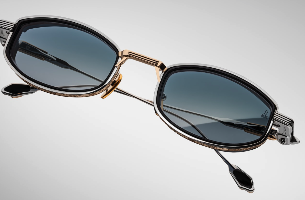 From the first Last Frontier titanium series, these oval ’50s-inspired glasses feature finely engraved eye-rims and extended acetate eye shields, complemented by sculptural precious metal arrowhead temple motif complemented by polished ‘thunderbir...
