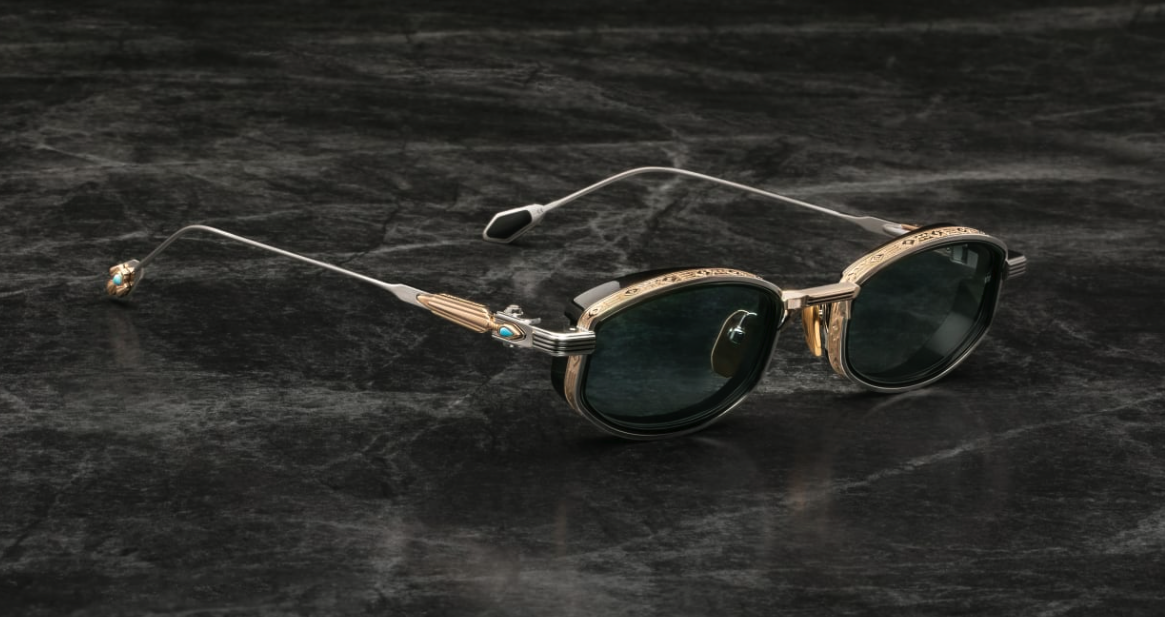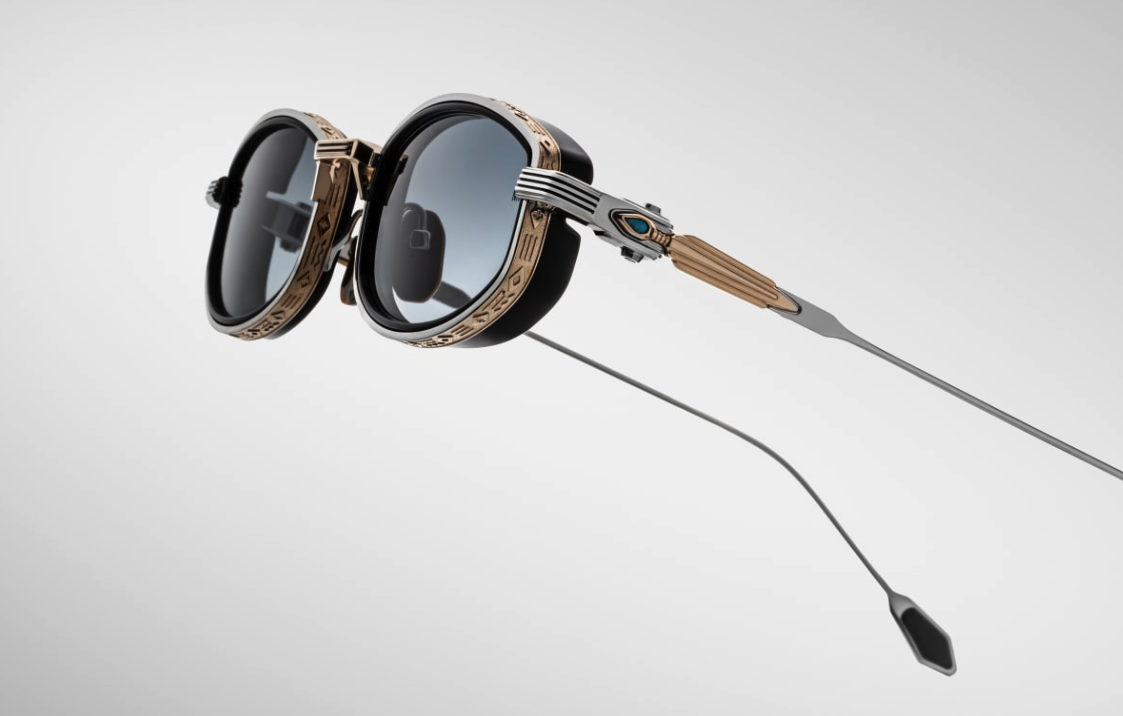 Experience the freedom of the open road in first-of-their-kind spectacles accustomed to majestic canyon views mingling amidst rugged mountains, rolling hills, and semi-arid plains, where sentiments like sediments form floodplains full of history and lore, a pageantry of past lives and lasting loves swept into the fore. These ’50s-inspired spectacles feature titanium eye rims with finely-engraved Chimayo-inspired designs, extended acetate eye shields, an artistic arrowhead temple motif plated in 18k Gold or Sterling Silver with turquoise inlays, and ‘thunderbird’ medallions plated in 18k Gold or Sterling Silver at the temple tips, featuring turquoise inlays.